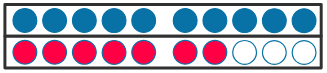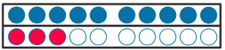 Für eine Addition im Zwanzigerfeld zeige ich das Beispiel 10+3=13. Da die 10 blauen Punkte der ersten Pluszahl schon liegen, müssen wir nur die 3 roten Punkte der zweiten Pluszahl an die blauen Punkte anhängen. Die roten Punkte liegen jetzt auf den Zahlen 11, 12 und 13. Das Ergebnis der Addition 10+3 ist also 13.