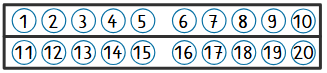 Dieses besteht aus zwei Zehnerreihen. Die obere Zehnerreihe ist für die Zahlen von 1 bis 10, die untere Zehnerreihe ist für die Zahlen von 11 bis 20. Die Zahlenreihen in den weißen Punkten zeigen dir den Aufbau dieses zwanziger Punktefeldes.