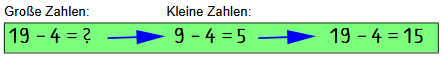 Die folgende Rechenstrategie kennst du auch schon. Die Minusaufgaben sind in großen Zahlen vorgegeben, du kannst aber mithilfe der kleinen Zahlen schnell zum Ergebnis kommen. Schaue dir die Beispielaufgabe 19-4 an und du erkennst sofort, wie du rechnen musst.