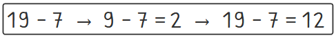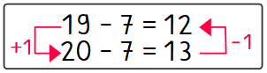 Das Rechnen mit den Nachbarzahlen kennst du schon von den Additionen. Hier bei den Subtraktionen werden dir die Nachbarzahlen auch eine Hilfe sein. Wenn die Beispielaufgabe 19-7 noch zu schwer für dich ist, kannst du von der ersten Zahl, der 19, die Nachbarzahl 20 nehmen, denn du weißt schon, dass 20-7=3 ist. Da du aber bei der ersten Zahl einen zu viel gerechnet hast, musst du beim Ergebnis eine 1 wegnehmen.