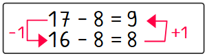 Das zweite Beispiel lautet 17-8. Hier kannst du mit der Nachbaraufgabe 16-8 schnell rechnen. Von den Zahlenhalbierungen weißt du, dass das Ergebnis 8 ist. Da du aber bei der ersten Zahl einen weniger gerechnet hast, 16 statt 17, musst du das Ergebnis um eine 1 erhöhen. Schau dir die ganze Beispielrechnung an. Lies und sprich mit.