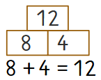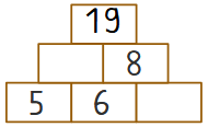 Beispiel 1 ist die einfachste Form der Zahlenmauer. In beiden Fußsteinen befinden sich Zahlen, die addiert werden. Das Ergebnis der Addition schreibst du in den Kopfstein. Die passende Rechenaufgabe steht unter der Zahlenmauer.