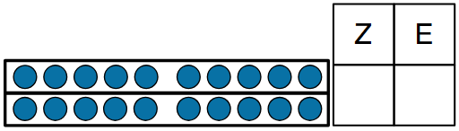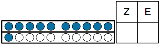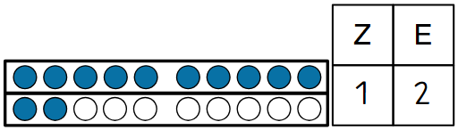 In unserem Beispiel gibt es einen Zehner, also kommt unter dem Z eine 1. Und da es zwei Einer gibt, kommt unter dem E eine 2.