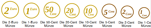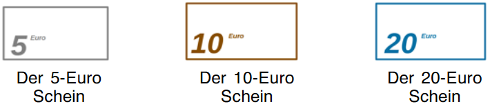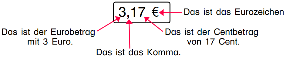 Alle diese Zahlen besitzen einen Punkt oder ein Komma. Die Zahlen links vom Komma werden als Euro gelesen und die Zahlen rechts vom Komma werden als Cent gelesen. Ganz rechts von der Zahl befindet sich das Euro-Zeichen €.